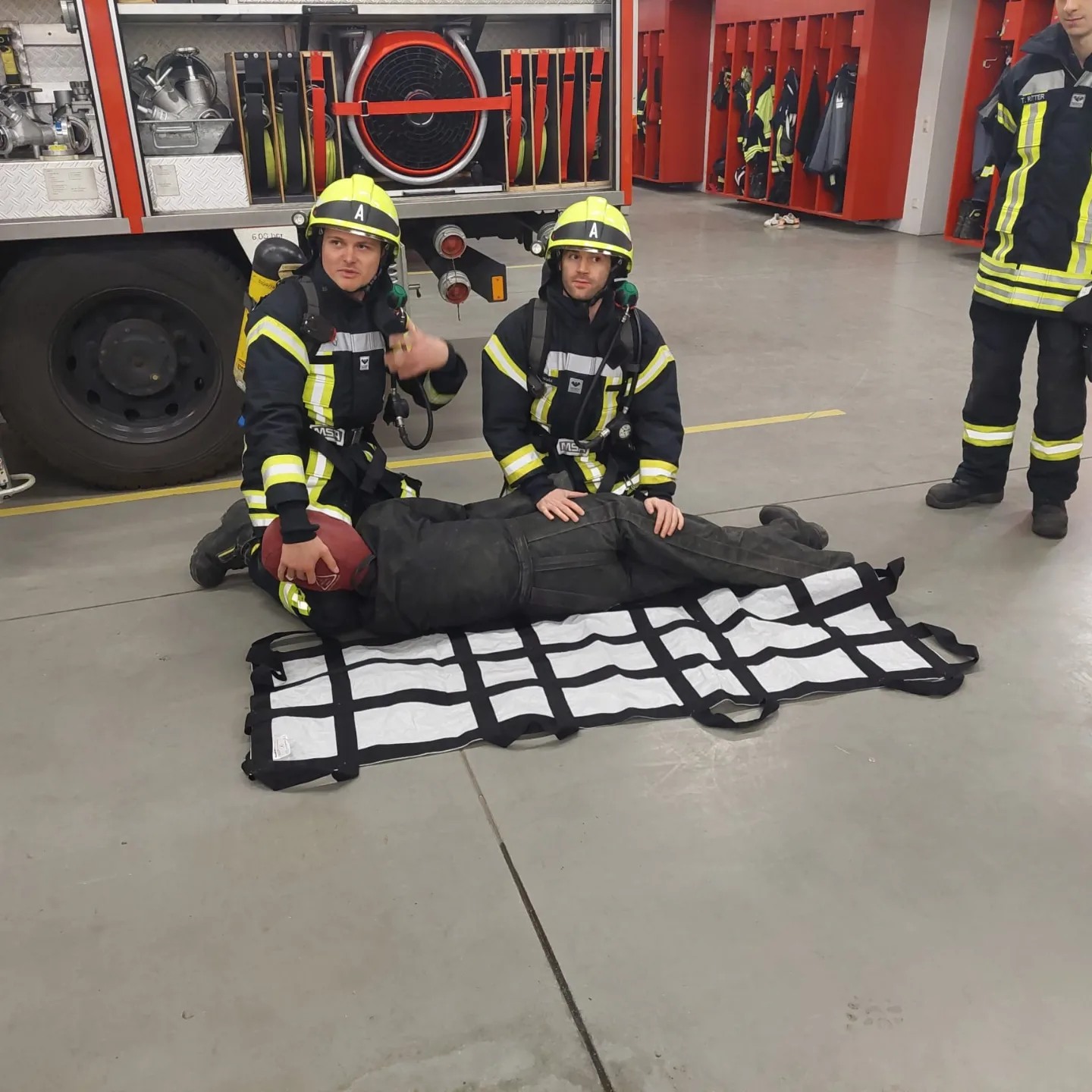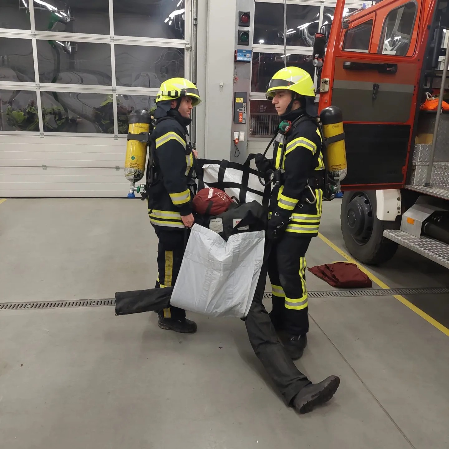 In der letzten Atemschutzübung widmeten wir uns der Personenrettung mit Fluchthaube und Rettungstuch und das Retten eines Atemschutzkameraden.