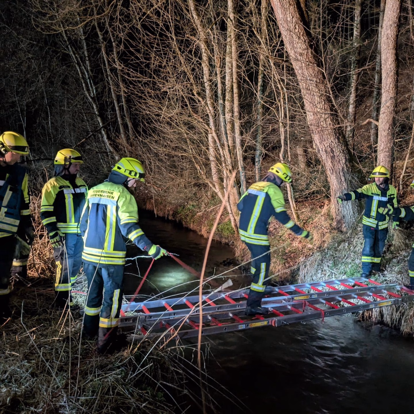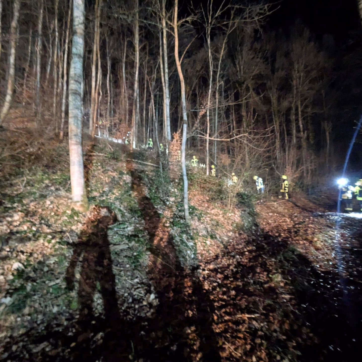 Die Aufgabenstellung lautete: Ein vermisster Waldarbeiter. Es war bereits dämmerig, doch wir wussten, in welchem Waldstück wir suchen mussten. Zunächst musste Licht geschaffen werden, und wir improvisierten eine Brücke über einen kleinen Bach, um die Einsatzkräfte sicher zum betreffenden Waldstück zu bringen. Dort stellten wir uns in einer Reihe auf und liefen das Waldstück ab. Schließlich fanden wir die vermisste Person.